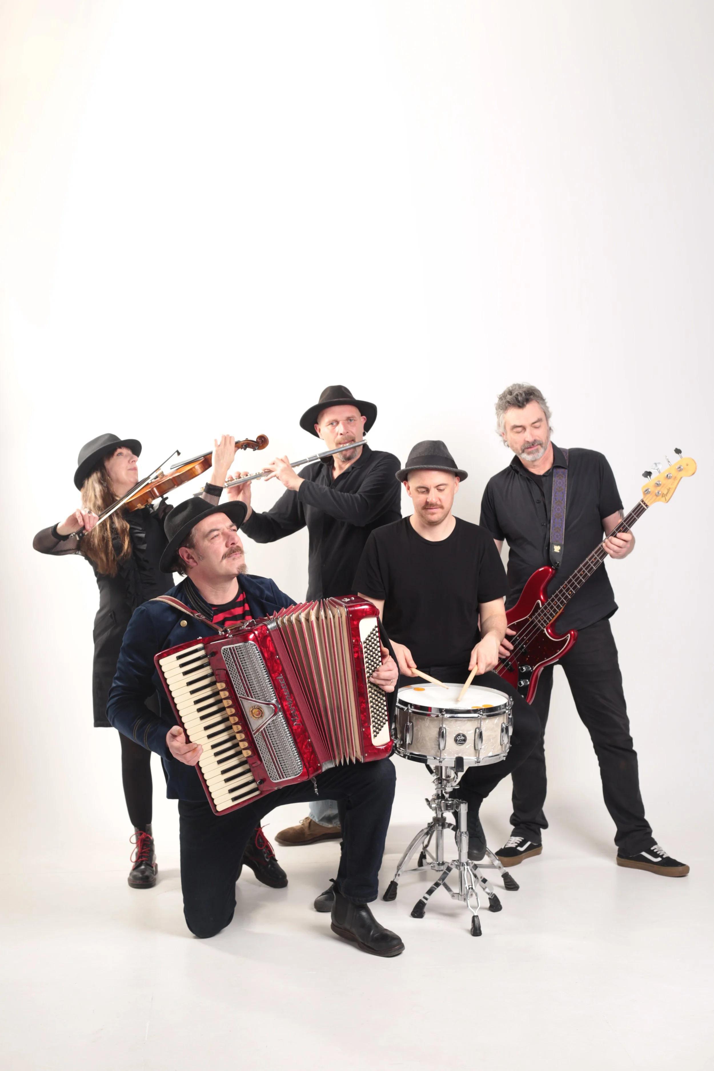 Mad Dog Mcrea blend a unique mixture of folk rock, pop, gypsy jazz, bluegrass and ‘shake your ass’ music. From self-penned songs of adventure, drinking, love and life, to traditional songs of gypsies, fairies, legless pirates and black flies – Mad Dog never fail to capture their audience with their infectious songs. In constant demand and having played just about every festival and two-bit, jibe-arsed dive in Christendom, Mad Dog Mcrea are, in every sense of the word, a live, band.
