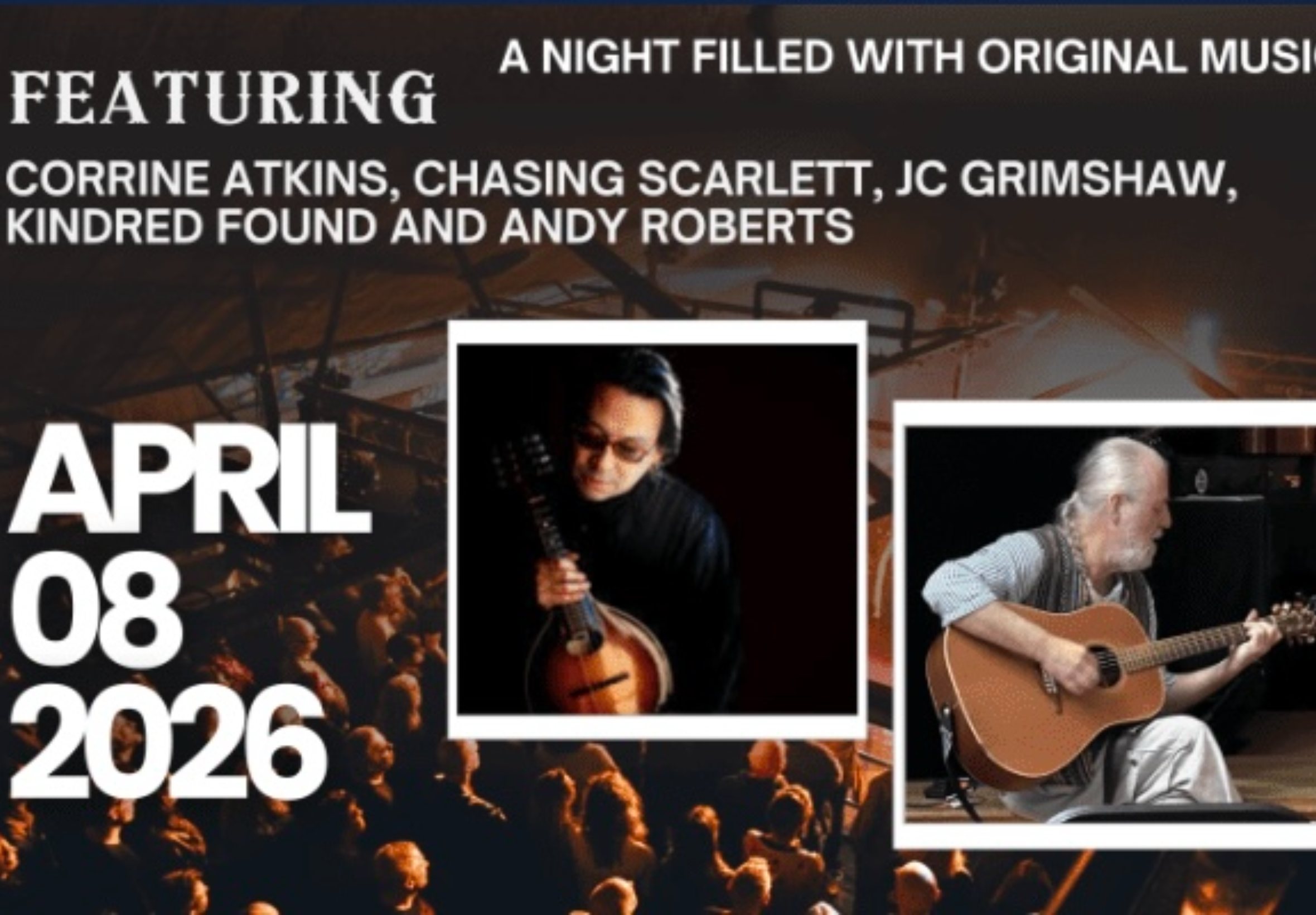 Featuring a talented lineup of songwriters including Corrine Atkins, Chasing Scarlett, JC Grimshaw, Kindred Found, and Andy Roberts, telling you the stories behind their songs and performing their original material in a relaxed, acoustic setting.